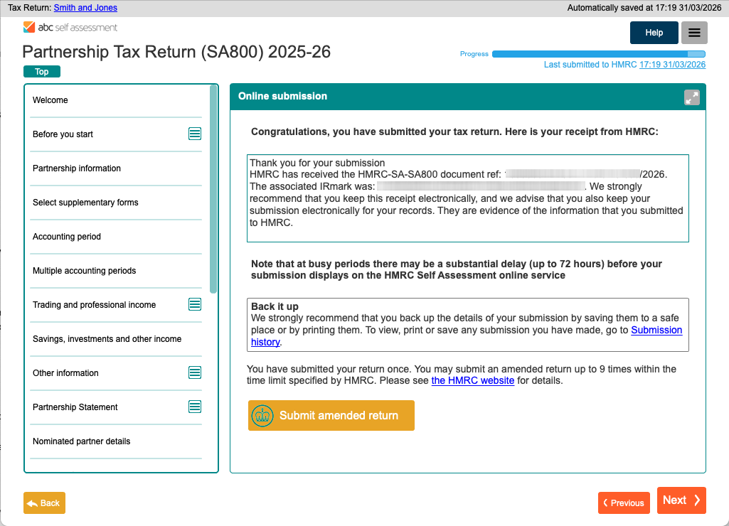 ABC SA800 Partnership Tax Return can be used to submit the SA800 to HMRC electronically. It has the same questions as the HMRC paper forms, and and displays the forms in a similar manner.